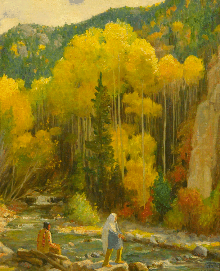 “Indians Fishing—Taos Canyon”, circa 1900, Oil on canvas, 20 x 16 inches, Panhandle-Plains Historical Museum, Canyon, Texas, Purchase funded by The Barrick Foundation, Amarillo, Texas.