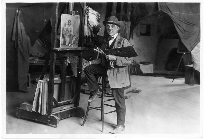 Sharp's second studio, completed in 1915, began as a small house which he enlarged into a two-story structure, with an enormous studio window to the north and a loft at the south end, from which he hung some of his extensive collection of Indian costumes and artifacts. In one corner of the studio by the kiva fireplace is a round window with a square frame which appears in some of his paintings. After returning from a trip to Egypt in 1914, Sharp decided to remodel his outhouse in the configuration of an Egyptian mastaba, and called it “Little Egypt.” The building still exists next to his studio.